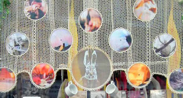 | "Daheim ist, wo das Sofa fehlt" Von den Mitgliedern der Gruppe Hasenbart gefertigt, ziert seit dem 1. Juni 2011 eine gehäkelte Scheibengardine das Schaufenster eines Tonträgerfachgeschäfts in Hamburg. Zum Thema "Daheim" wurden 11 Picture-Singles, ein transparenter Longplayer und 2 Tassen in das aufwändige Häkelwerk eingearbeitet und in einem Fenster des Ladens installiert. "Die Stimme des Hasen trägt mich Heim", so der Titel der Arbeit, entstand für die Kunstaltonale 2011 und nimmt am Wettbewerb "Kunst im Schaufenster" teil. *mehr* | ![]() Installation vom 1.6. bis 31.7.2011 bei Slam Records Hamburg Altona, Bahrenfelder Strasse 98. |
